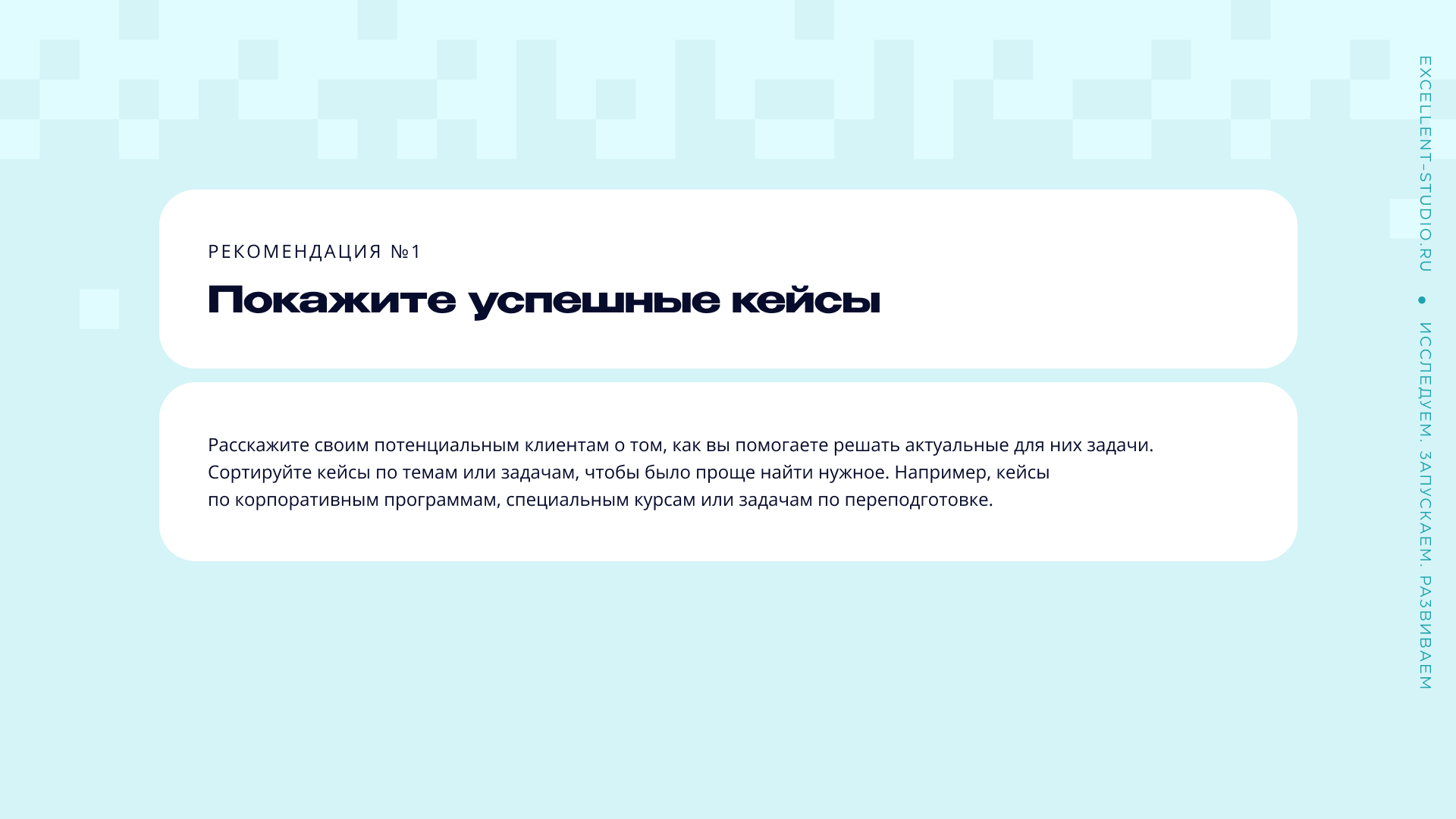 Рекомендация: расскажите своим потенциальным клиентам о том, как вы помогаете решать актуальные для них задачи. Сортируйте кейсы по темам или задачам, чтобы было проще найти нужное. Например, кейсы по корпоративным программам, специальным курсам или задачам по переподготовке.