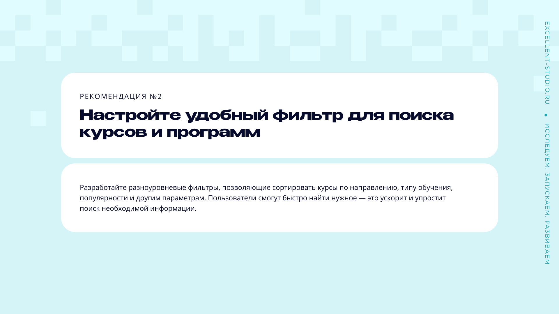 Рекомендация: разработайте разноуровневые фильтры, позволяющие сортировать курсы по направлению, типу обучения, популярности и другим параметрам. Пользователи смогут быстро найти нужное — это ускорит и упростит поиск необходимой информации.
