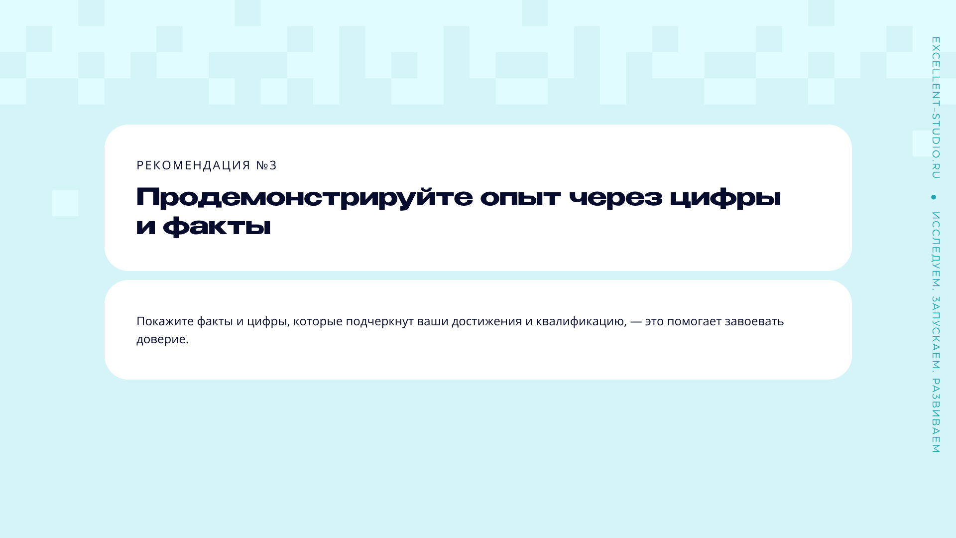 Рекомендация: покажите факты и цифры, которые подчеркнут ваши достижения и квалификацию, — это помогает завоевать доверие. Это как результаты на ладони: понятно, прозрачно и сразу видно, что вы — профессионалы.