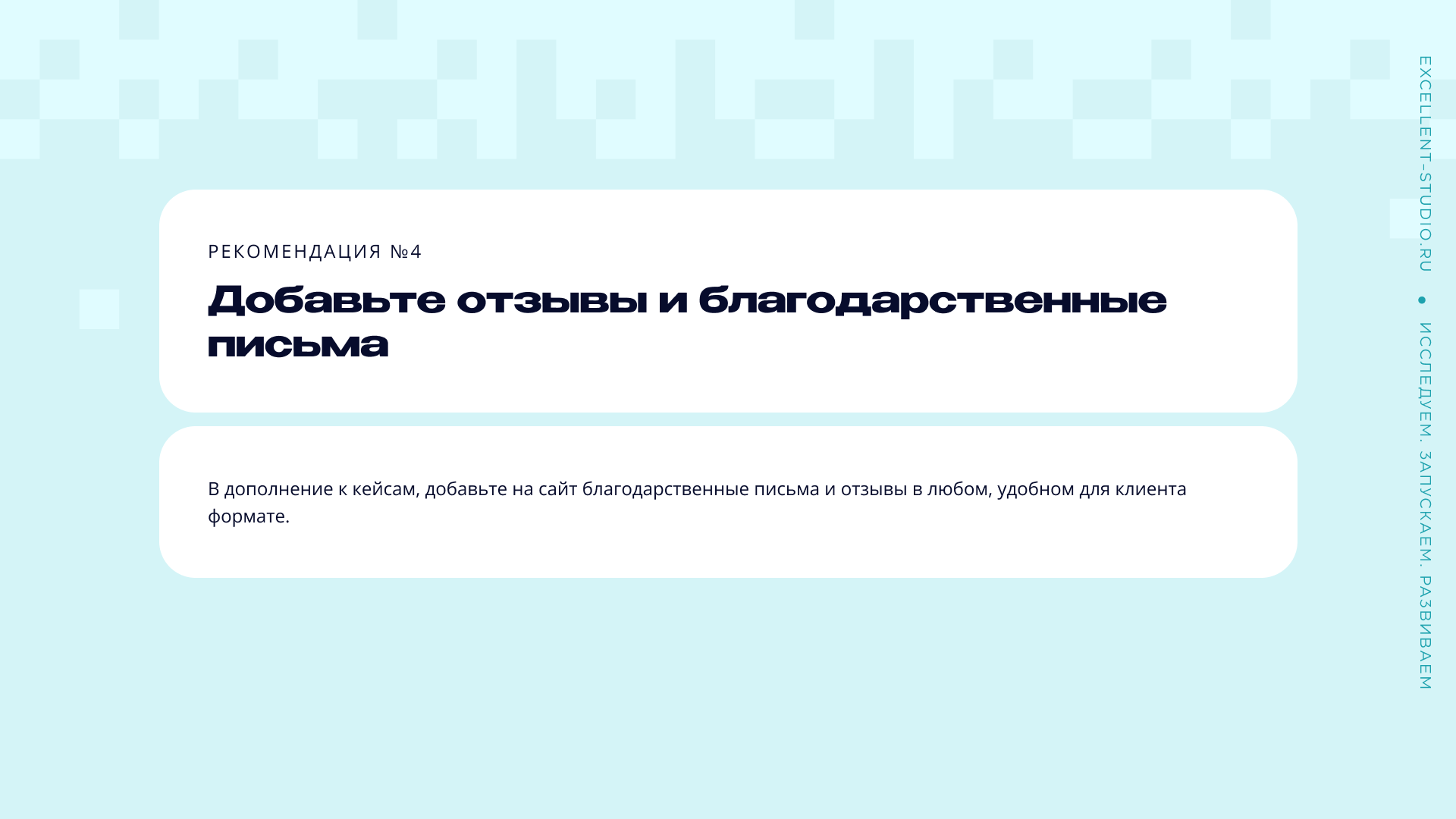 Рекомендация: в дополнение к кейсам разместите на сайте благодарственные письма и отзывы в любом удобном для клиента формате. Чем больше «живых» откликов, тем больше доверия к вам.
