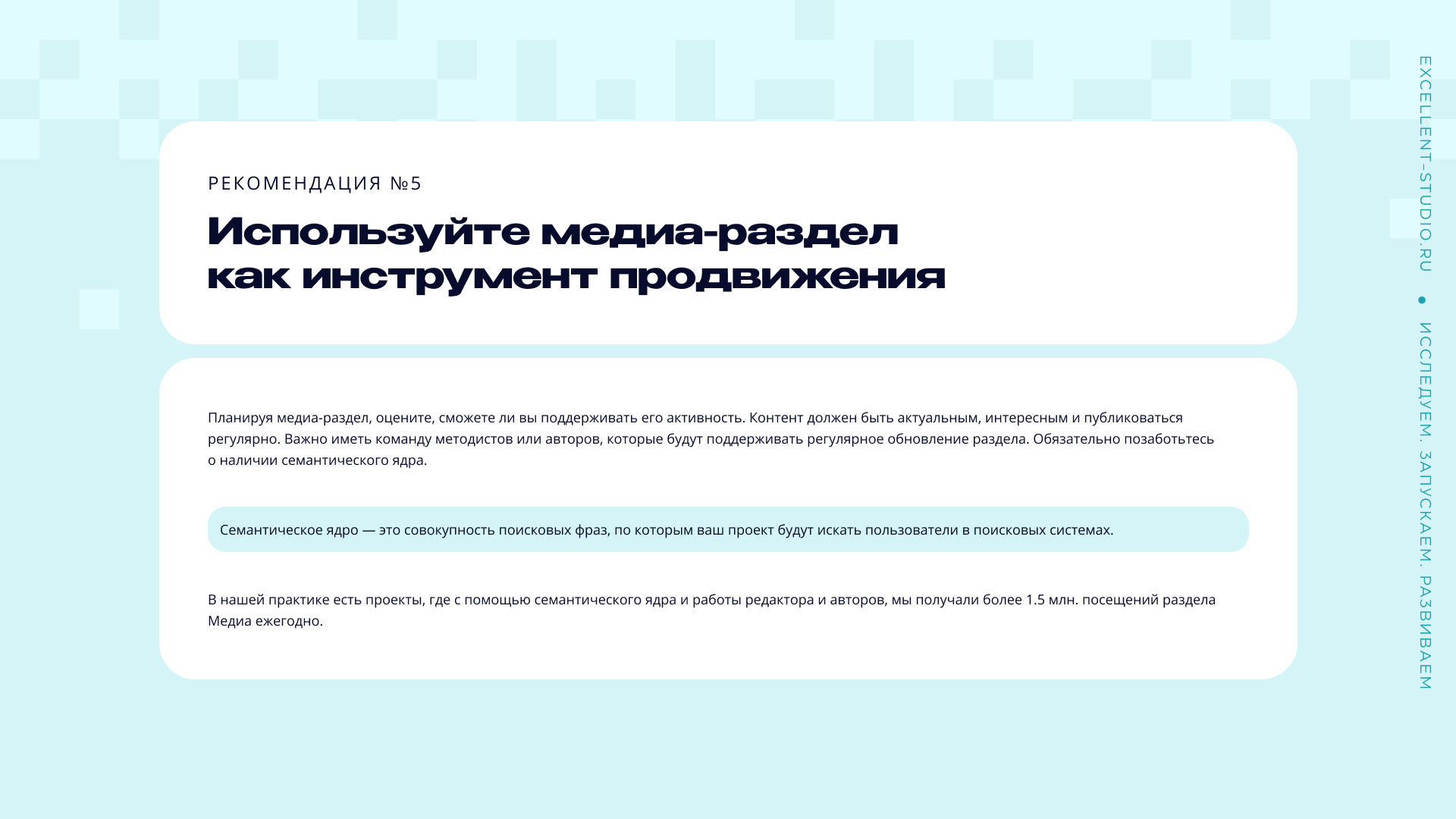 В нашей практике есть проекты, где с помощью семантического ядра и работы редактора и авторов, мы получали более 1.5. млн посещений раздела Медиа ежегодно.