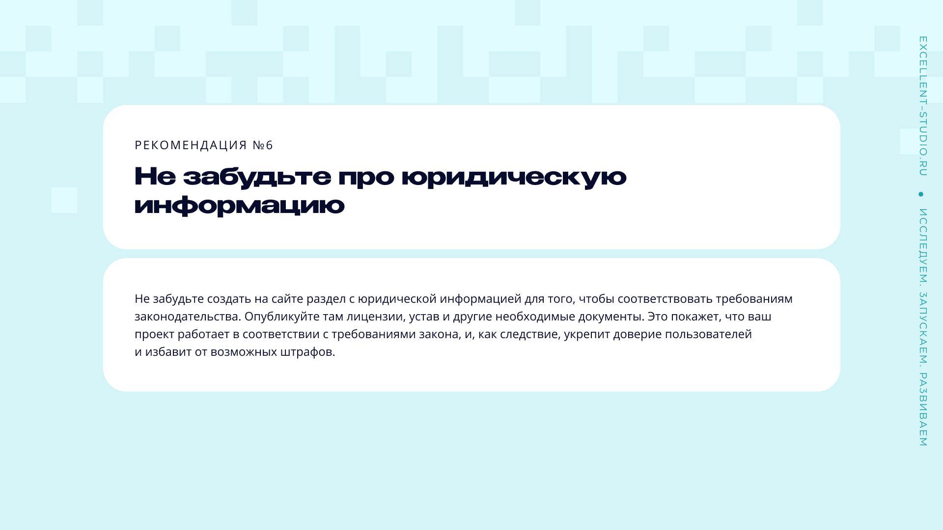 Рекомендация: создайте на сайте раздел с юридической информацией для того, чтобы соответствовать требованиям законодательства. Опубликуйте там лицензии, устав и другие необходимые документы. Это покажет, что ваш проект работает в соответствии с требованиями закона, и, как следствие, укрепит доверие пользователей.