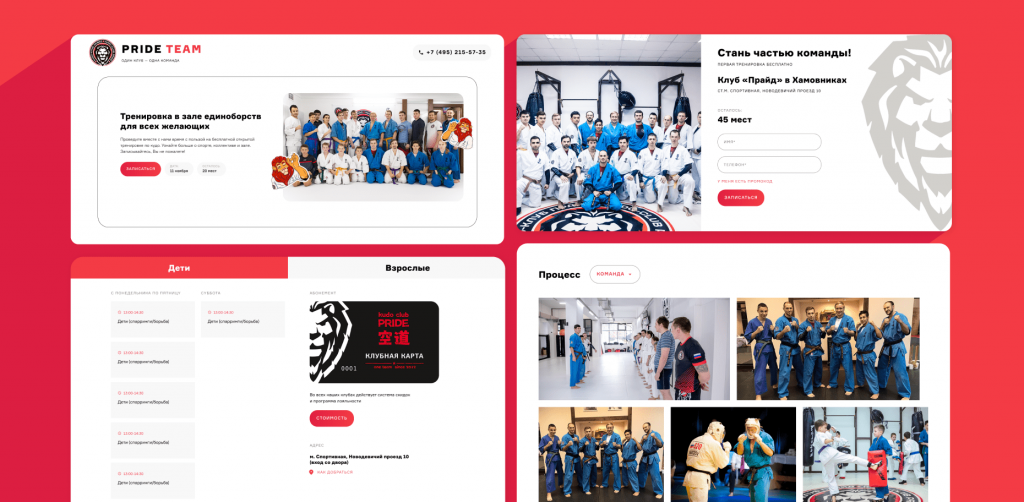 Разделили информацию о занятиях для детей и взрослых, прописали идеологию клуба, опубликовали мотивационные истории одноклубников, разработали удобный формат расписания и даже ввели обратный отсчет до следующей тренировки.
